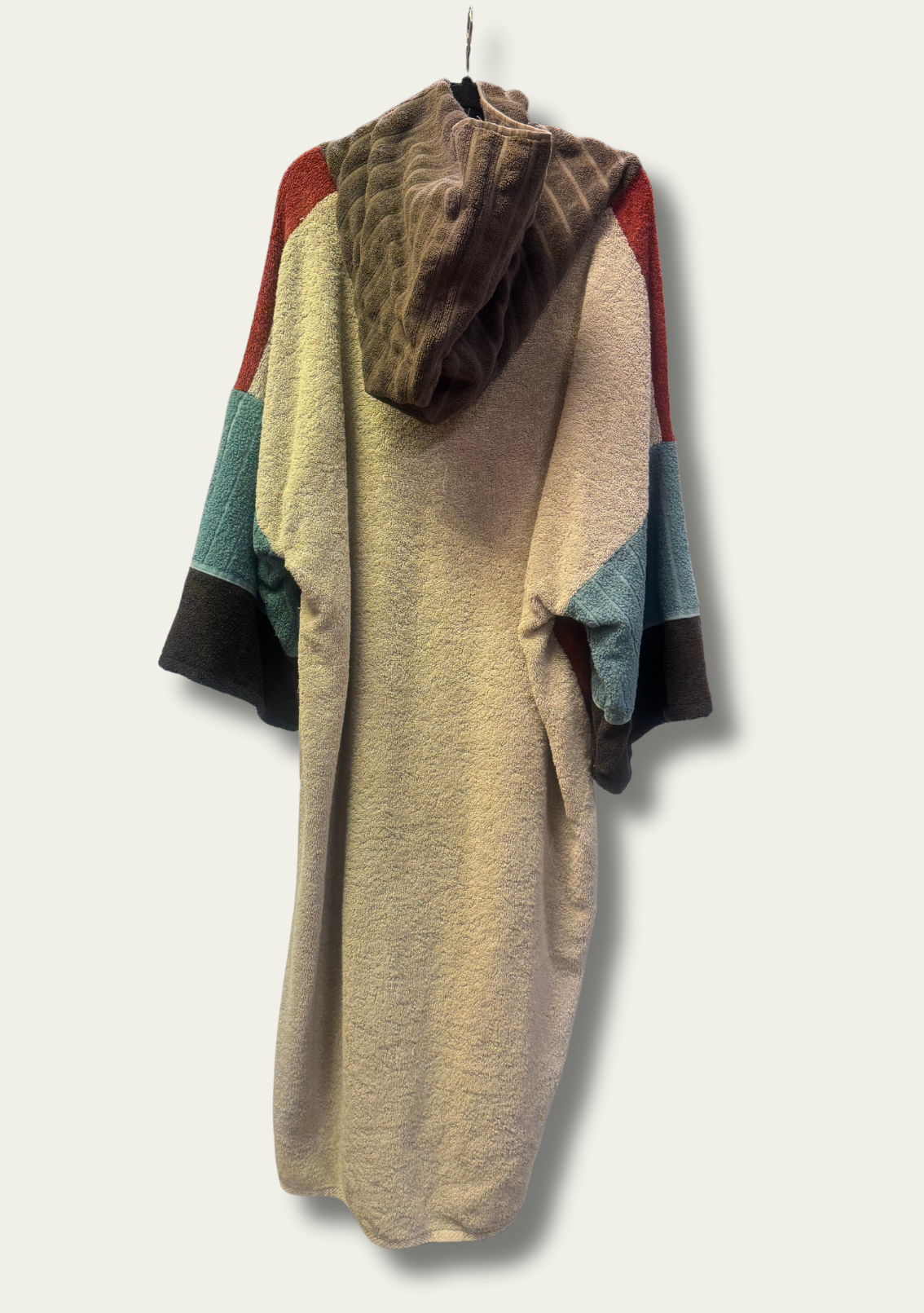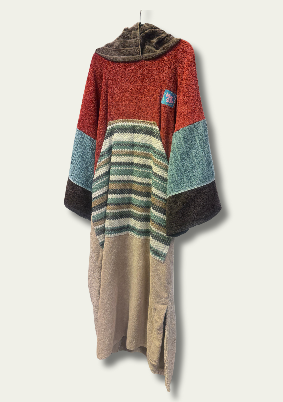 Mysi badeponcho er unikt designet og håndsydd av oss – laget av gjenbrukte, rensede håndklær som får nytt liv i en ny form. Resultatet er en myk, fargerik og helt unik hettegenser – ingen er like. Mysi ponchoen er i one size og passer til de aller fleste.